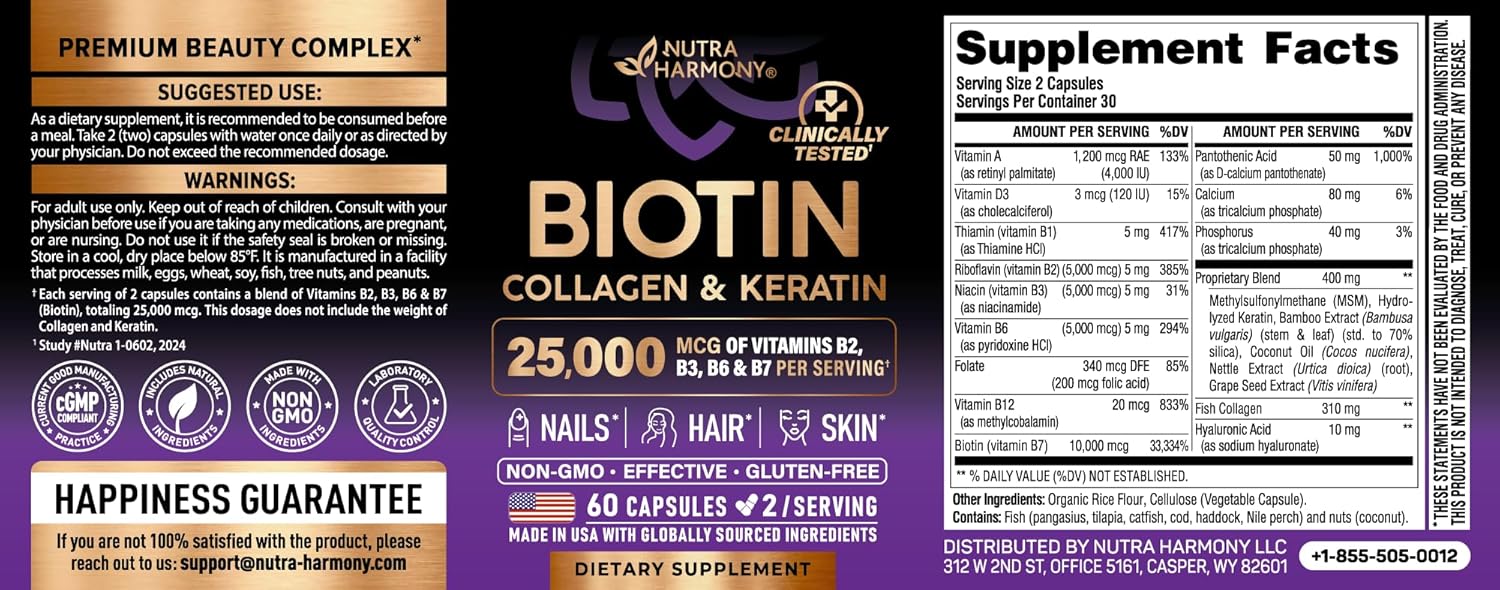 NUTRAHARMONY Biotin | Collagen | Hyaluronic Acid | Keratin – Support Normal Hair Growth Cycle – Skin & Nails – 25000mcg Vitamins B1, B2, B3, B6